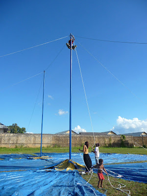 Comme prévu, sous la direction de Wilson, monteur professionnel brésilien, nous avons débuté l'installation de notre chapiteau sur le terrain des roches bleues, derrière l'office du tourisme de Saint-Laurent.